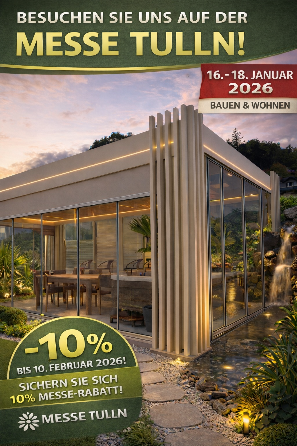 Darüber hinaus können Sie uns dreimal im Jahr auf der Messe Tulln besuchen, wo wir unsere Neuheiten und Sonnenschutzlösungen vorstellen und neue zufriedene Kunden gewinnen. Dies ist eine ideale Gelegenheit, unser Angebot zu präsentieren.
